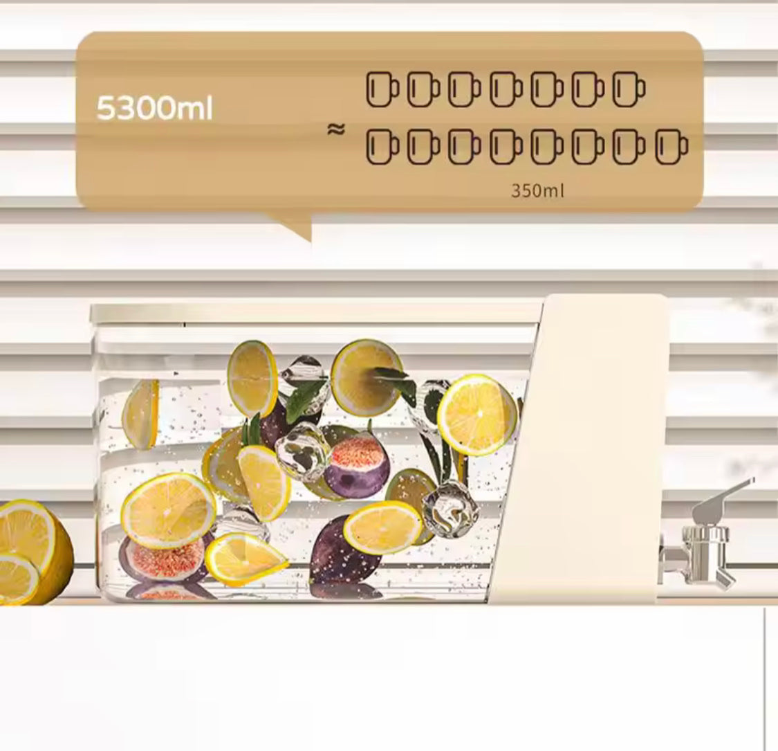 This 5.3L refrigerator drink dispenser is a large-capacity beverage container designed for easy storage and dispensing in your refrigerator. With a leakproof design, it ensures that your drinks stay securely sealed, preventing spills and maintaining freshness. Its generous 5.3-liter capacity is perfect for storing a variety of beverages, from juices to iced tea, making it ideal for family gatherings or daily use. The container features a convenient spout for controlled pouring, allowing you to serve drinks with ease while maximizing space in your fridge.