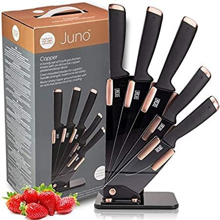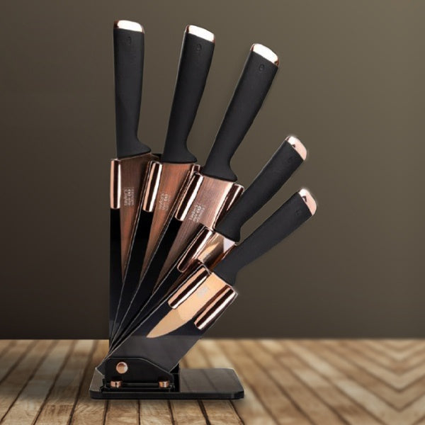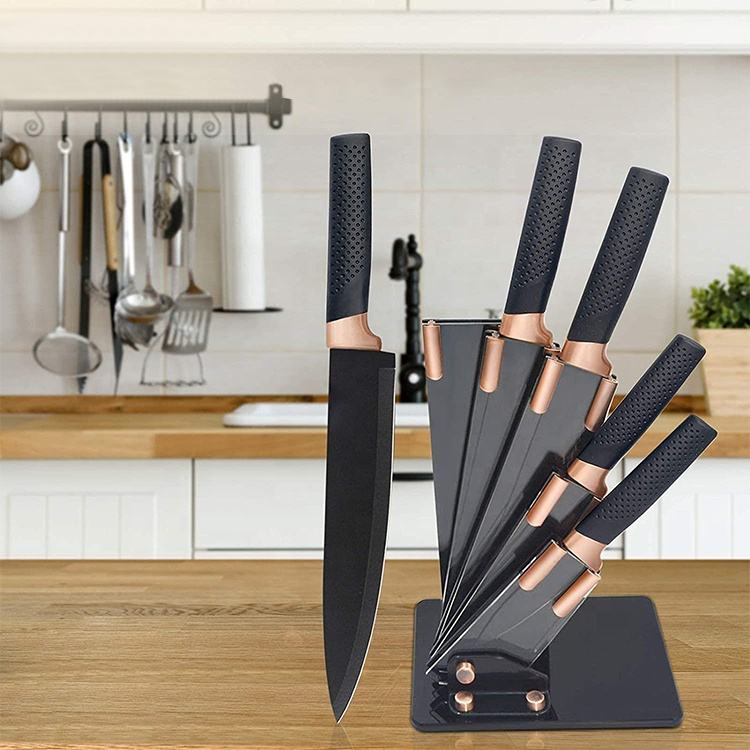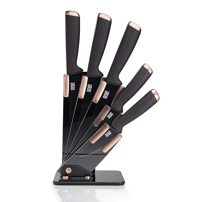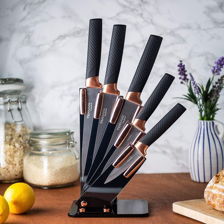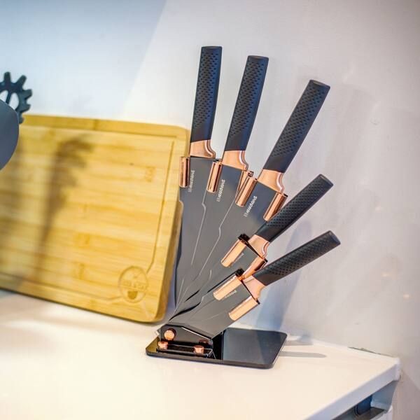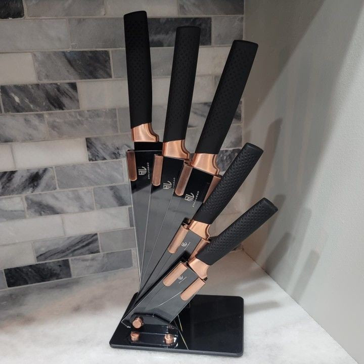 Attractive copper plated bolster with finger guard. Contempary attractive fan shaped acrylic knifeblock with black coloured base and copperhighlights