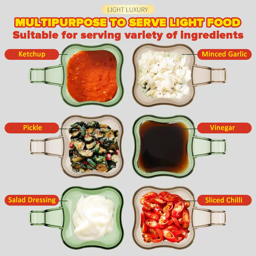 6pcs multipurpose dipping plate. Used for serving variety of ingredients and food. Made from environmental friendly materials, PET plastic material.