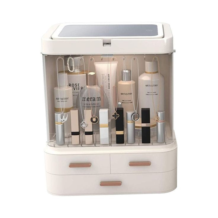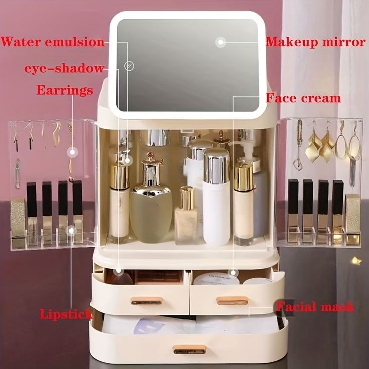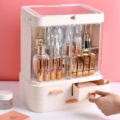 Large Capacity & Dust Free Waterproof : The makeup organizer box with cover stores your cosmetic items of different shapes and sizes while keeping them well organized. Decorated with clear lid and drawers, protecting your cosmetics away from dust and water, The lower two-tier storage drawers could dividedly store lipsticks, lip gels, makeup brushes, eyebrow pencils, foundation sticks, beauty gadgets, necklaces, rings, and more.