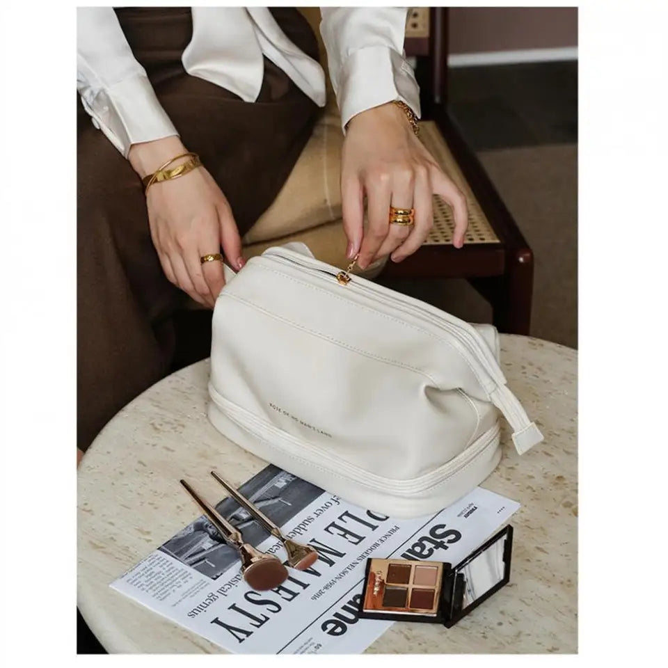 【Premium Quality Material】 This travel makeup bag is made of high-quality PU leather fabric that is easy to clean and has a water-resistant surface, ensuring that your makeup and toiletries stay dry and protected during your travels.